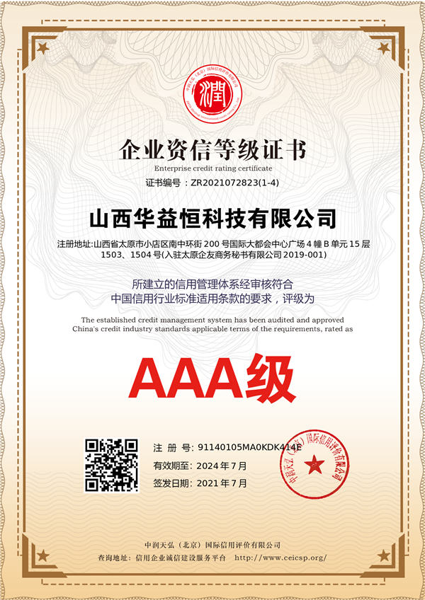 ↑ 華益恒AAA級企業(yè)信用等級證書